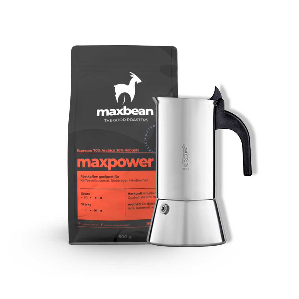 Erlebe italienischen Kaffeegenuss zu Hause – mit dem Bialetti Venus Espressokocher für 4 Tassen und 500g unserer kräftigen maxbean Röstung „maxpower“. Dieses exklusive Bundle bringt Design, Qualität und Geschmack in perfekter Harmonie zusammen – und das mit 10 % Rabatt gegenüber dem Einzelkauf!